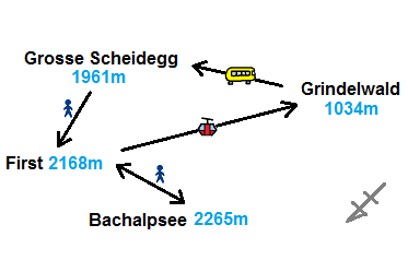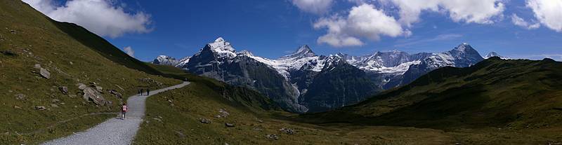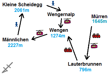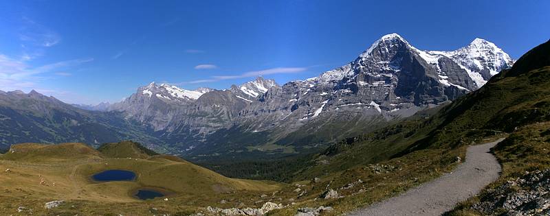 いったん山を下ってまた上ることになるが、時間的には他の行き方と大差ない。 ただ眺めはメンリッヒェン経由やクライネ・シャイデック経由の方がよい。 ⇒旅行中のできごと「グリンデルワルトへのルート」