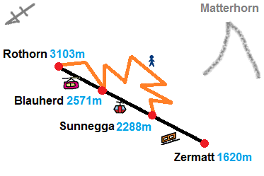 天気予報によると明後日は雨。 昨年のように3泊の間に一度もマッターホルン[Matterhorn]が見られなかったなんてことのないように、早々にツェルマットの方へ向かう。
