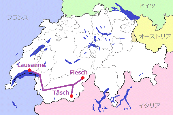 | 8/14(日) | アレッチュ氷河周辺(フィーシュ④、エッギスホルン、フィーシャーアルプ、ベットマーアルプ)ハイキング | ローザンヌ⑤ |