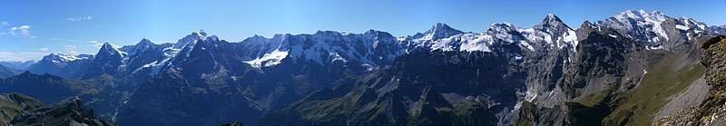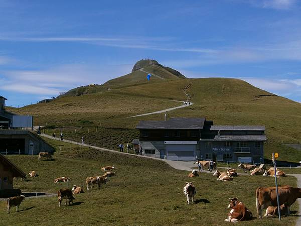山頂からは、後ろ側にトゥーン湖[Thunersee]やブリエンツ湖[Brienzersee]も見渡せるけど、三山方向の景色は山頂まで行かなくても正直あまり変わらない。