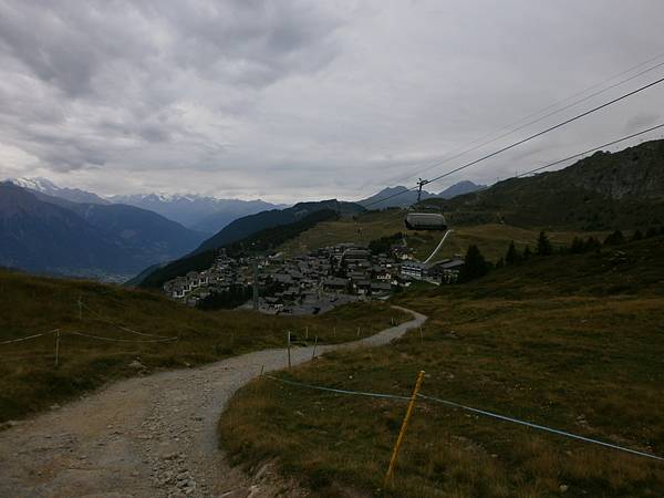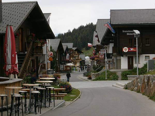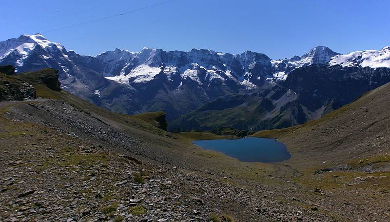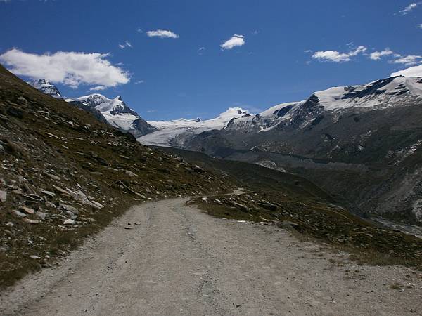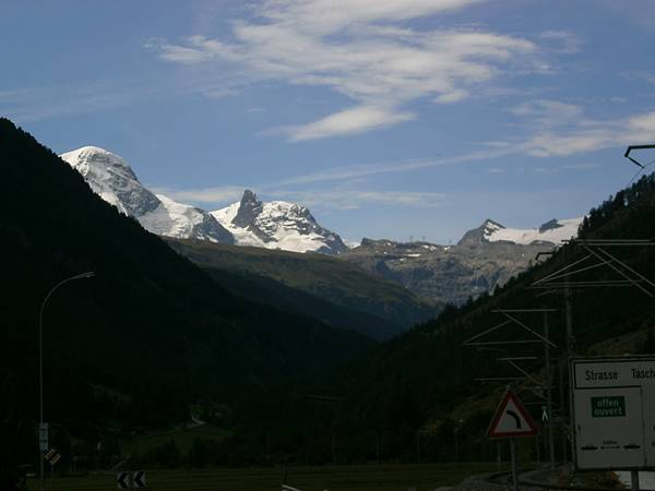 昨年見られなかったテッシュからの景色。 マッターホルンは見えないが、クラインマッターホルン[Klein Matterhorn](中央左よりのとがった所)とブライトホルン(左)が少し見える。