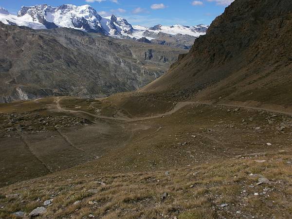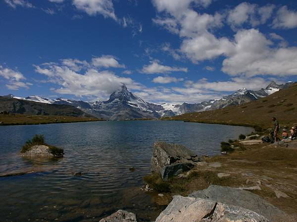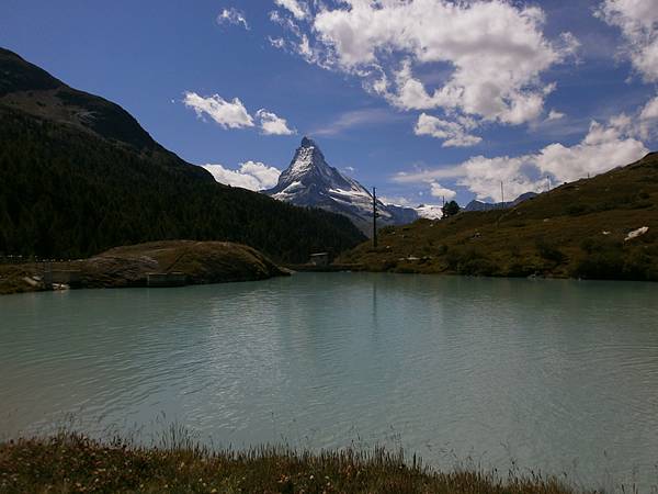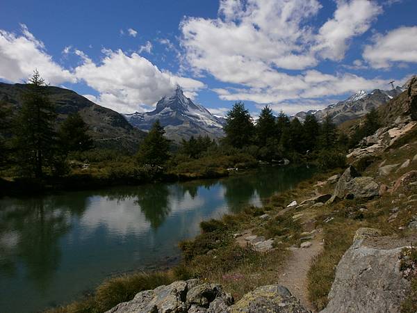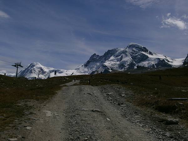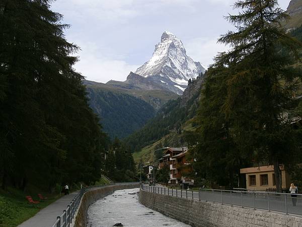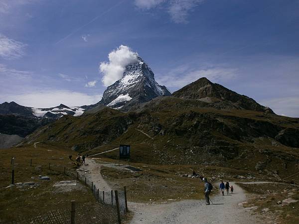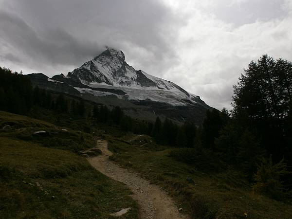 マッターホルンの形が完全に変わる。でも相変わらず頂上は雲隠れ。その上なんだか雲行きが怪しい。