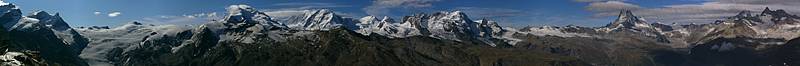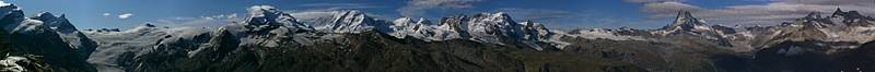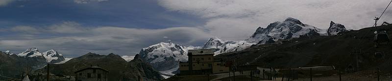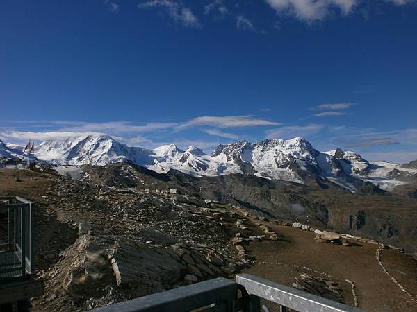 ロートホルンにて 左からモンテローザ[Monte Rosa](4634m)、リスカム[Liskamm](4527m)、ブライトホルン[Breithorn](4164m)