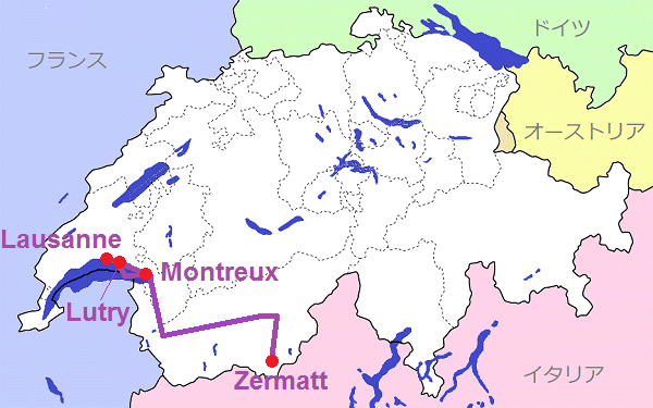 | 8/9(火) | レマン湖地方(ローザンヌ③、レマン湖沿い散策、リュトリー、レマン湖遊覧船、モントルー) | ツェルマット |