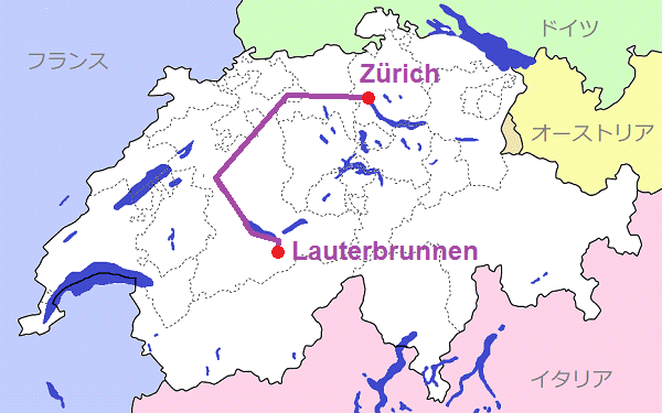 | 8/15(月) | ラウターブルンネン → チューリヒ → (飛行機) → 成田(8/16(火)) | 機内 |