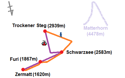 朝は霧雨が降って寒い。これから晴れるらしいのでロートホルン[Rothorn]へ行ってみようと乗り場に行くと、 テクニカルな問題とかで途中のスネガ[Sunnega]まで行くケーブルカーが動いていないと言われる。