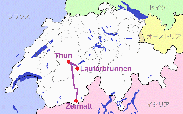 | 8/11(木) | マッターホルン周辺(ゴルナーグラート、リッフェルベルク)ハイキング、トゥーン④、トゥーン湖遊覧船 | ラウターブルンネン⑤ |