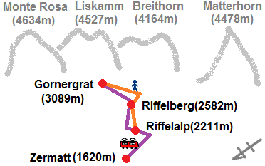 ツェルマットからはロートホルン[Rothorn]方面へ行こうとケーブルカー乗り場へ向かう。
