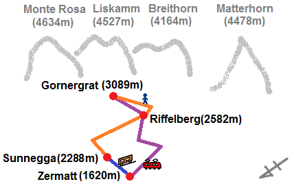 登るのは避けたいから、谷越え後そのまま下ってツェルマットへ行った方がいいだろうか。 でも、2012年はリッフェルベルクからモシェゼー経由でツェルマットへ下って4時間以上かかっている。