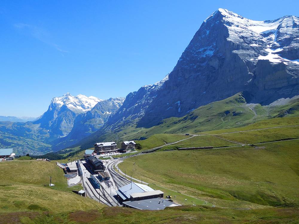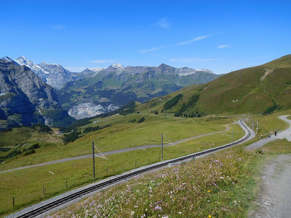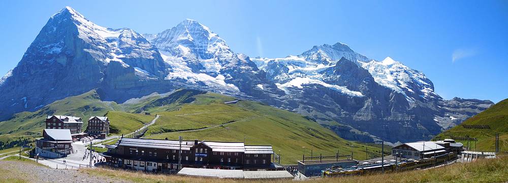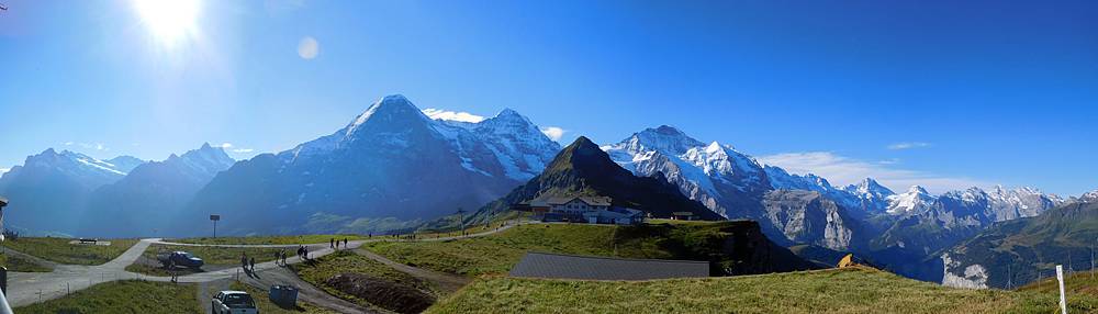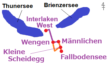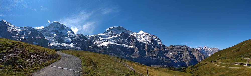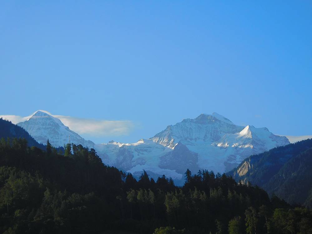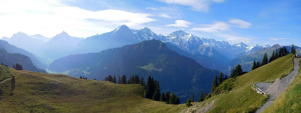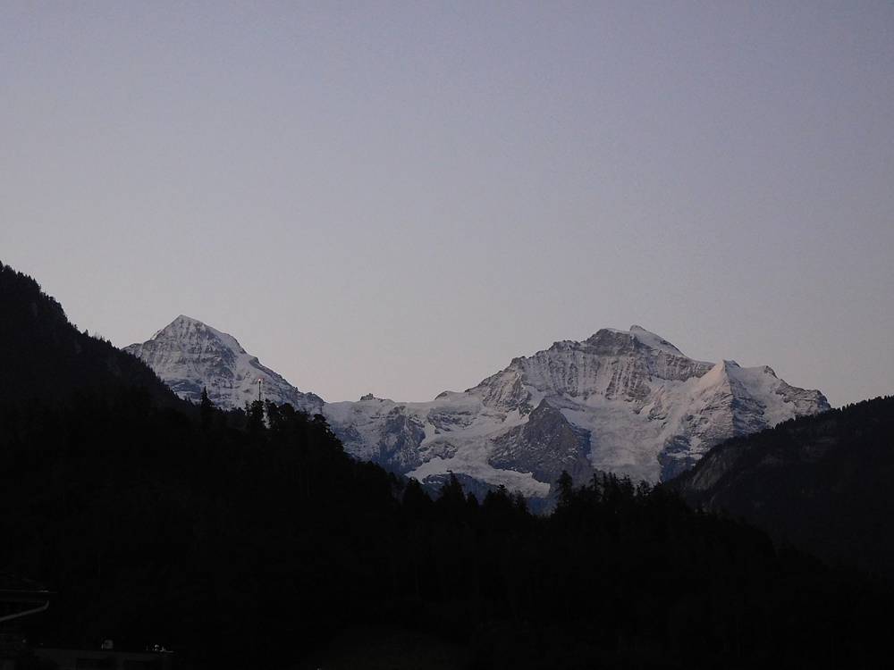 ユングフラウ地方では、左からヴェッターホルン、アイガー、メンヒ、ユングフラウの順に並んでいるが、 ここから見ると左からヴェッターホルン、メンヒ、アイガーの順に見えて、ユングフラウは見えない。