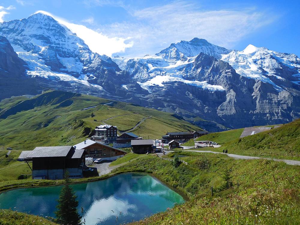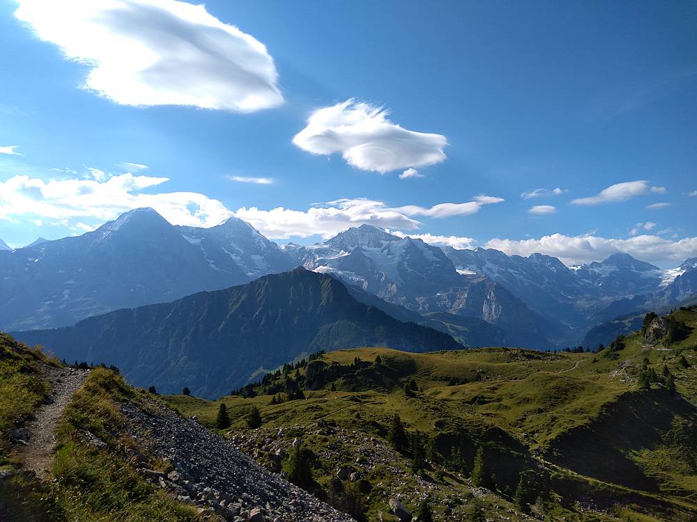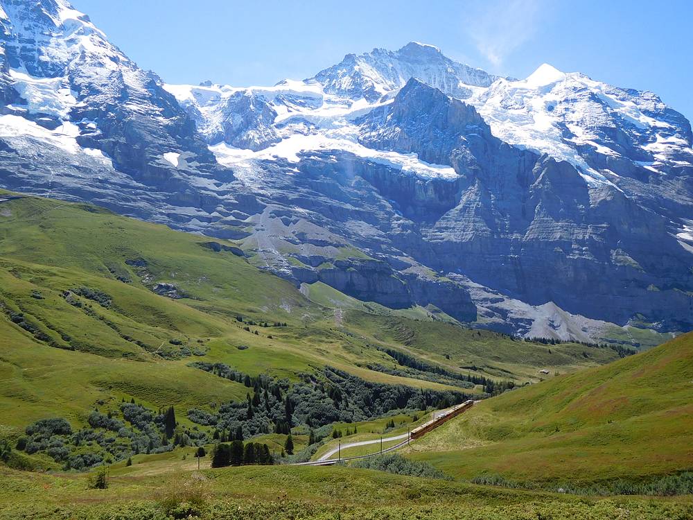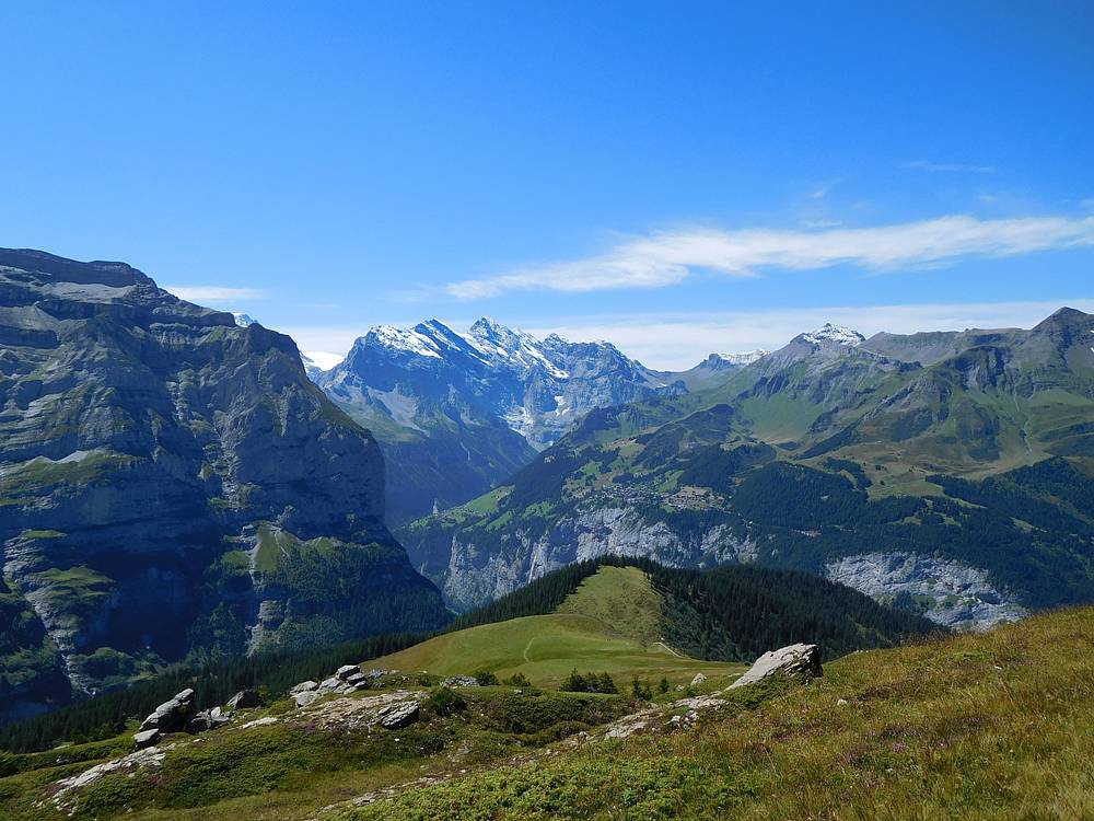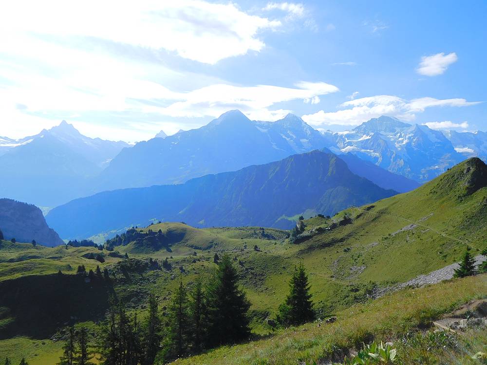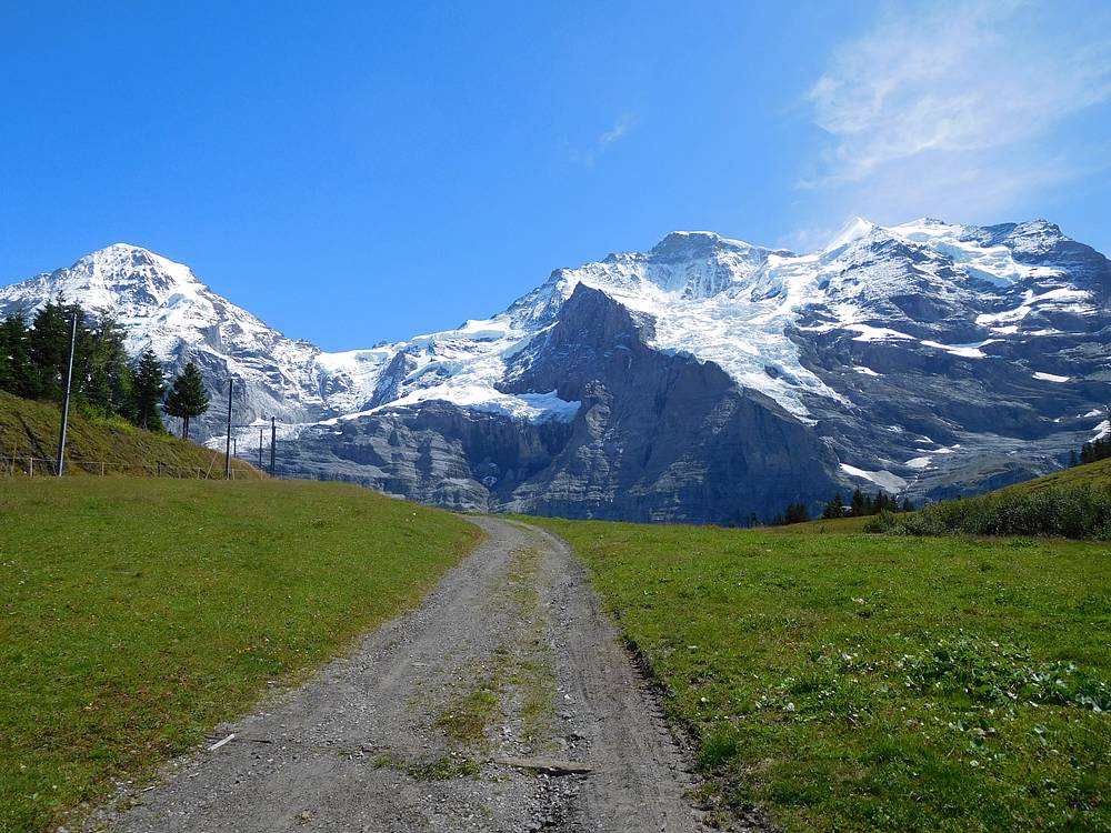 ユングフラウ地方では、左からヴェッターホルン、アイガー、メンヒ、ユングフラウの順に並んでいるが、 ここから見ると左からヴェッターホルン、メンヒ、アイガーの順に見えて、ユングフラウは見えない。