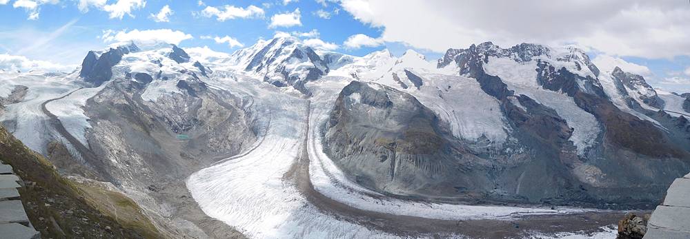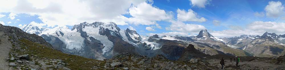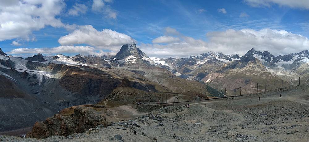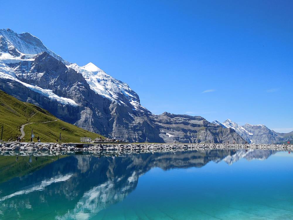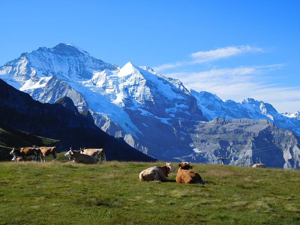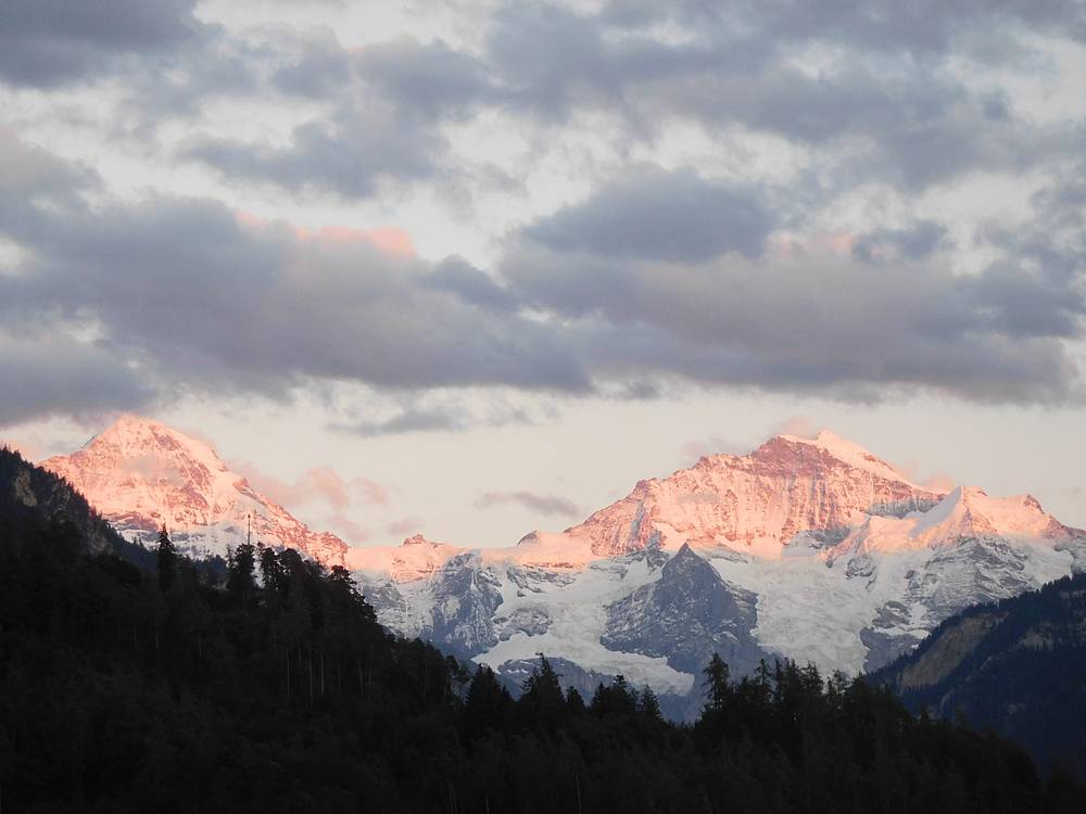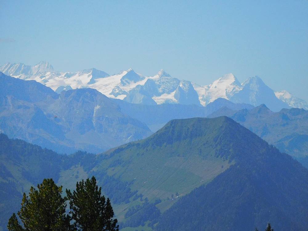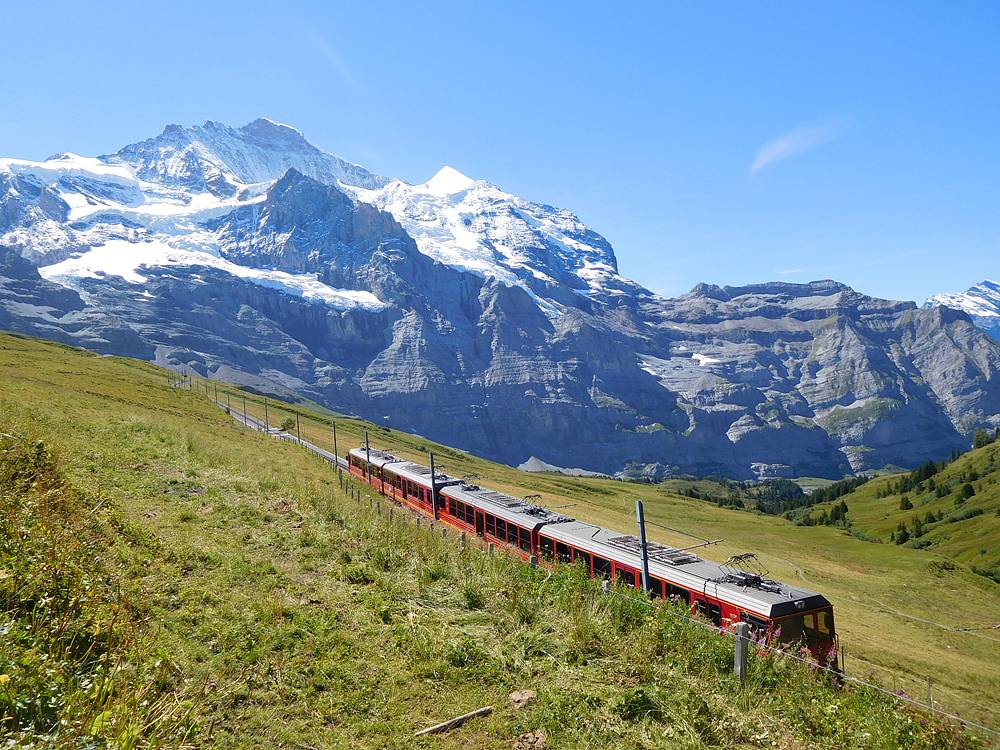 ユングフラウ地方では、左からヴェッターホルン、アイガー、メンヒ、ユングフラウの順に並んでいるが、 ここから見ると左からヴェッターホルン、メンヒ、アイガーの順に見えて、ユングフラウは見えない。