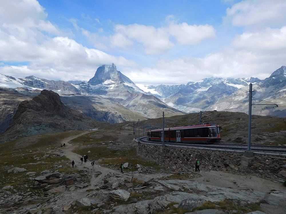 国鉄の出口、登山列車の切符売り場と乗り場、全て頭に入っているので、走って急いで切符を買って10:00発の登山列車に乗る。 天気予報通り、やっぱりマッターホルン方面は晴れていた。