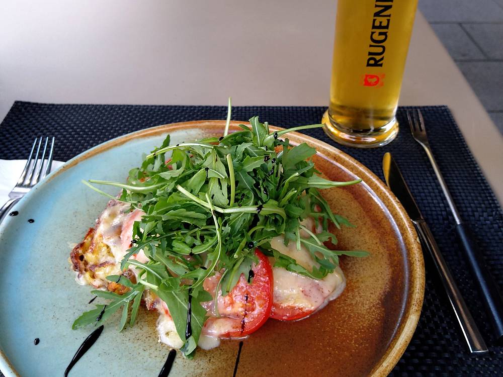レストランのテラス席で昼食。サラダビュッフェ(小)とビール、たったこれだけで2300円・・・