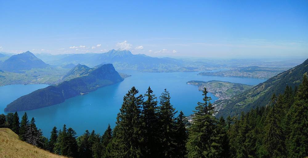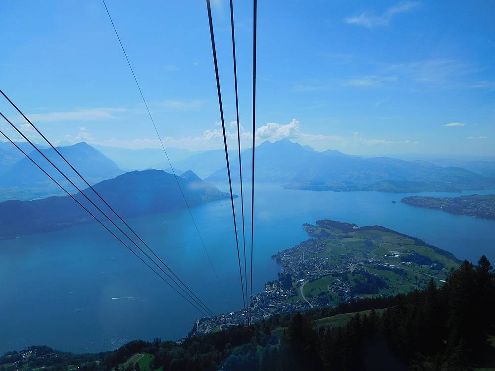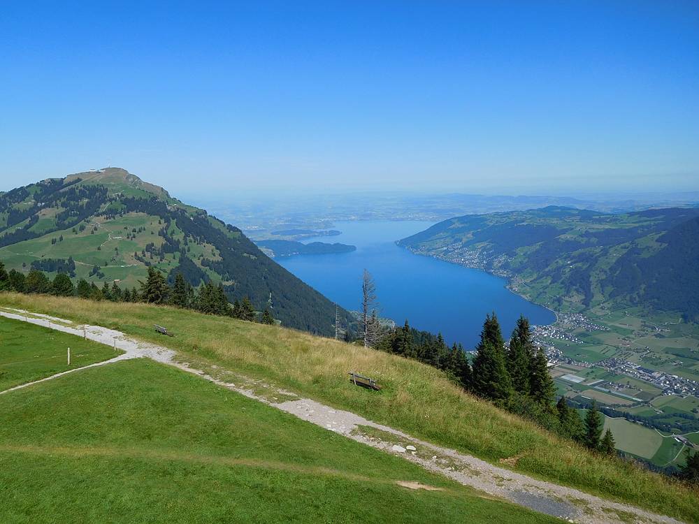 ツーク湖[Zugersee]が真っ青できれい。左の山がリギ山山頂。