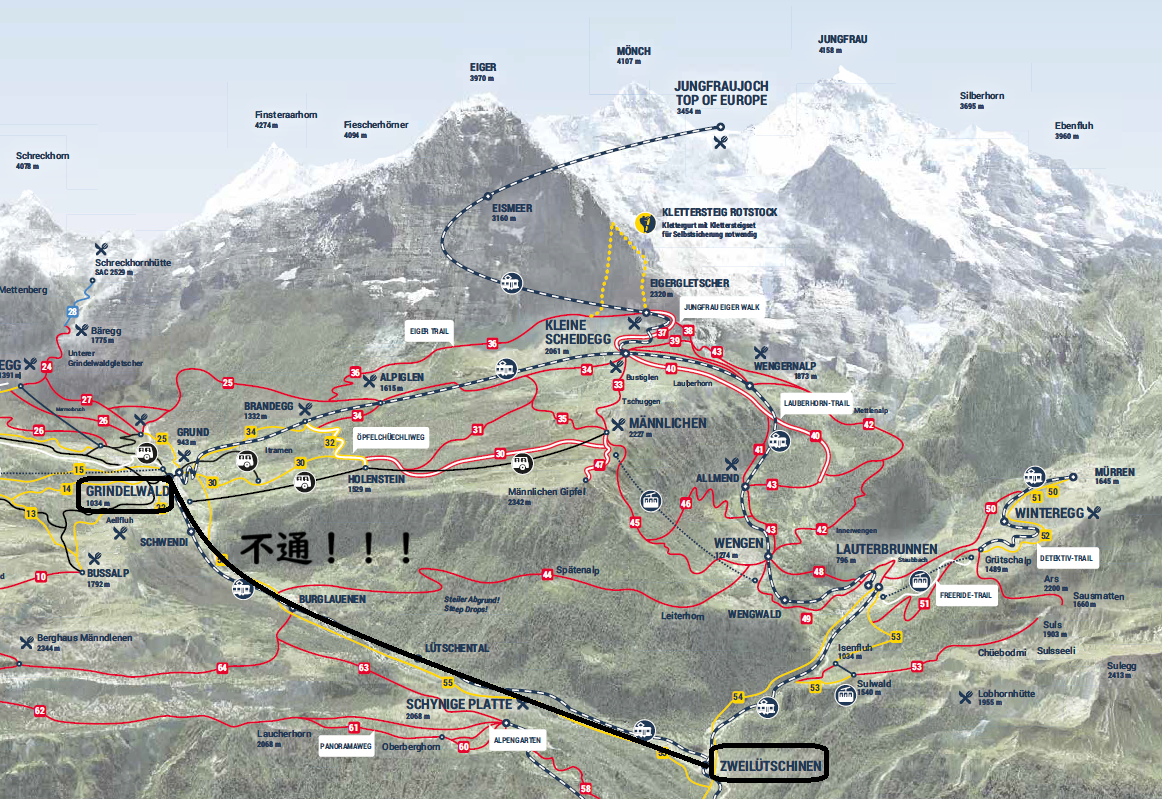 実はこの嵐、ユングフラウ地方に大変な被害をもたらしていて、グリンデルワルト[Grindelwald]、ツヴァイリュッチネン[Zweilütschinen]間の電車が不通になってしまったのだ。 しかも1週間近くも…⇒突然の嵐でインフラ大混乱