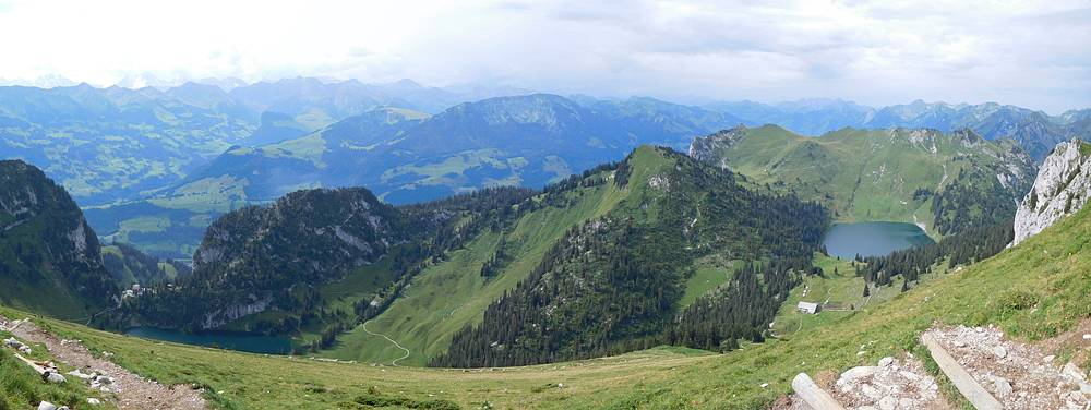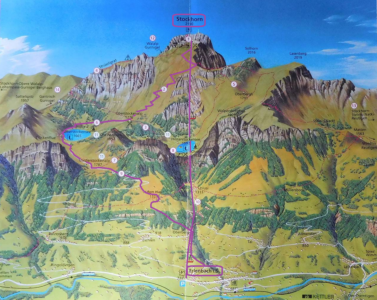 予定としては、ストックホルン(2190m)から2番、6番ルートを下ってオーバーシュトッケン湖[Oberstockensee](1665m)へ。 その後9番ルートでフォルダーシュトッケンアルプ[Vorderstockenalp](1787m)へ行き、そこからトロッティーバイクでエアレンバッハ(722m)へ戻る。