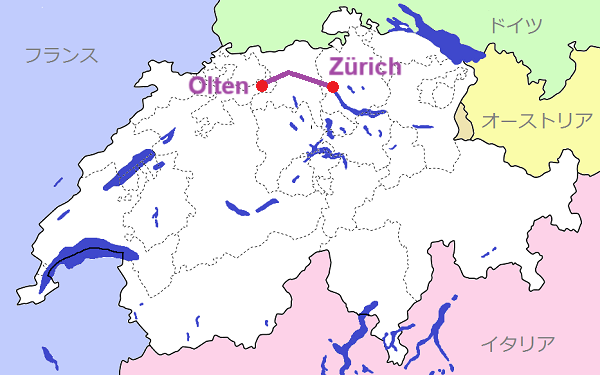 | 8/11(日) | 成田 → (飛行機) → チューリヒ① → オルテン② | オルテン |